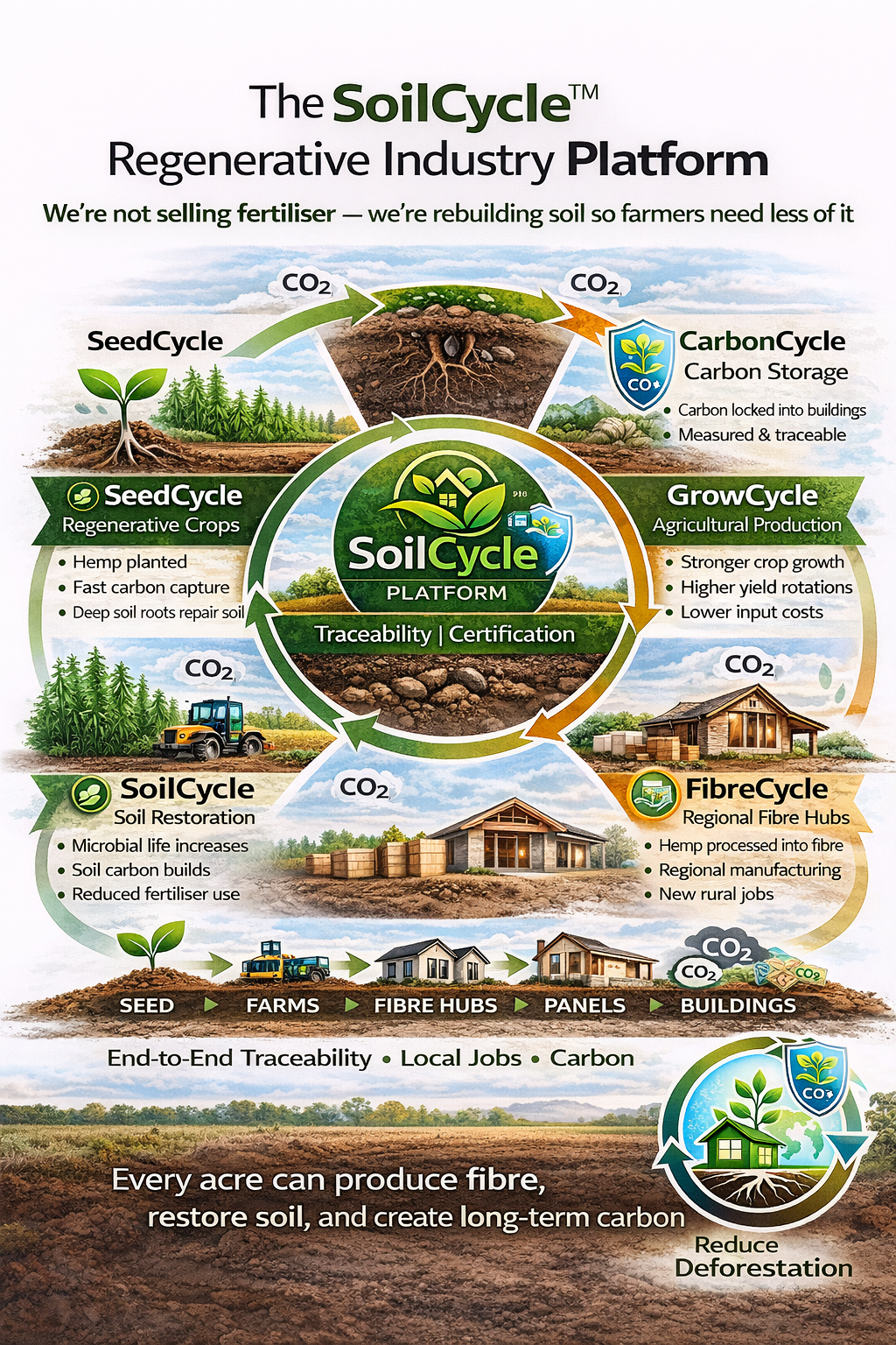 At the centre is SoilCycle™: a practical model for restoring land, producing natural fibre inputs, and creating valuable low-carbon outputs for construction, infrastructure and resource recovery.
